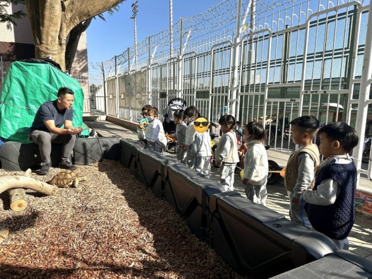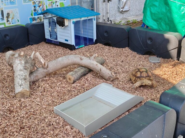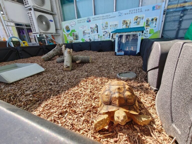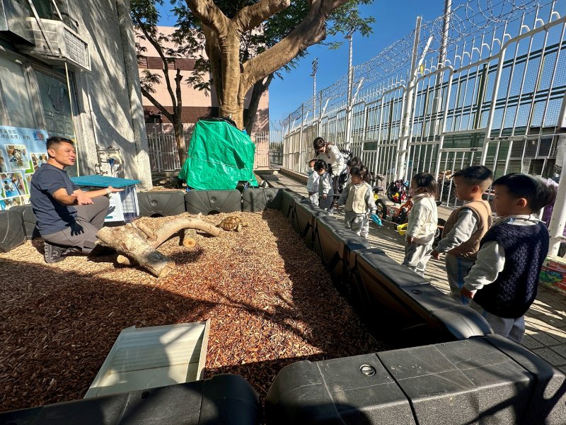 Recently, our aspiring veterinarian brother visited the school and suggested that we build an outdoor house for “Bouncy,” so he can enjoy his own “me time.” Today, “Bouncy’s” new home is finally complete! We even added organic wood chips for him to dig around and play freely, which also helps him strengthen his little muscles!